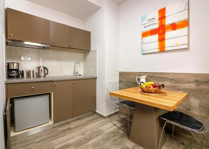 Dodatkową wygodę zapewnia dostęp do kuchenki mikrofalowej, czajnika elektrycznego i lodówki. Goście zatrzymujący się w obiekcie mogą korzystać z mini baru i urządzenia do parzenia kawy/herbaty. Najbliższa restauracja to Ta Bakaliarakia, która znajduje się zaledwie o krok od obiektu i serwuje potrawy kuchni greckiej. Obiekt leży zaledwie 5 min piechotą od najbliższego przystanku autobusowego Apokoronou.